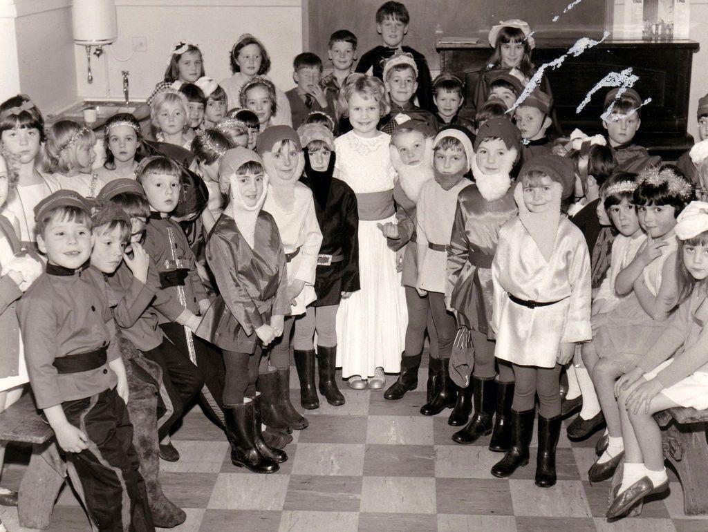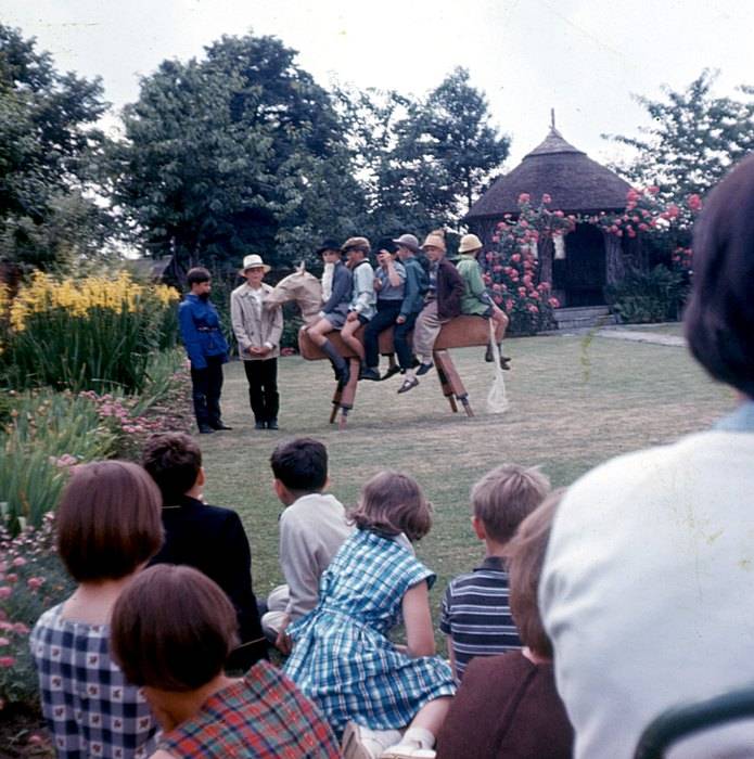 1964. Some of the boys dressed up as uncle Tom Cobley and friends, going to Widecombe Fair! Part of the school fete, in the Rose Garden, behind Somerset House.