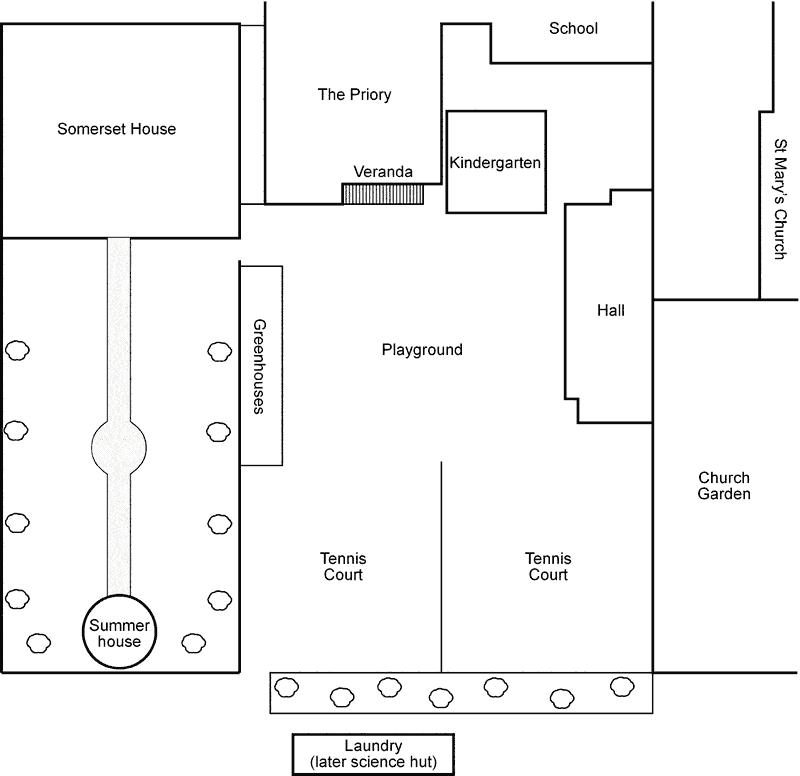 Plan of the back playground and gardens during the 60s. From memory, so not accurate! If you were there later, please tell us what had changed!
