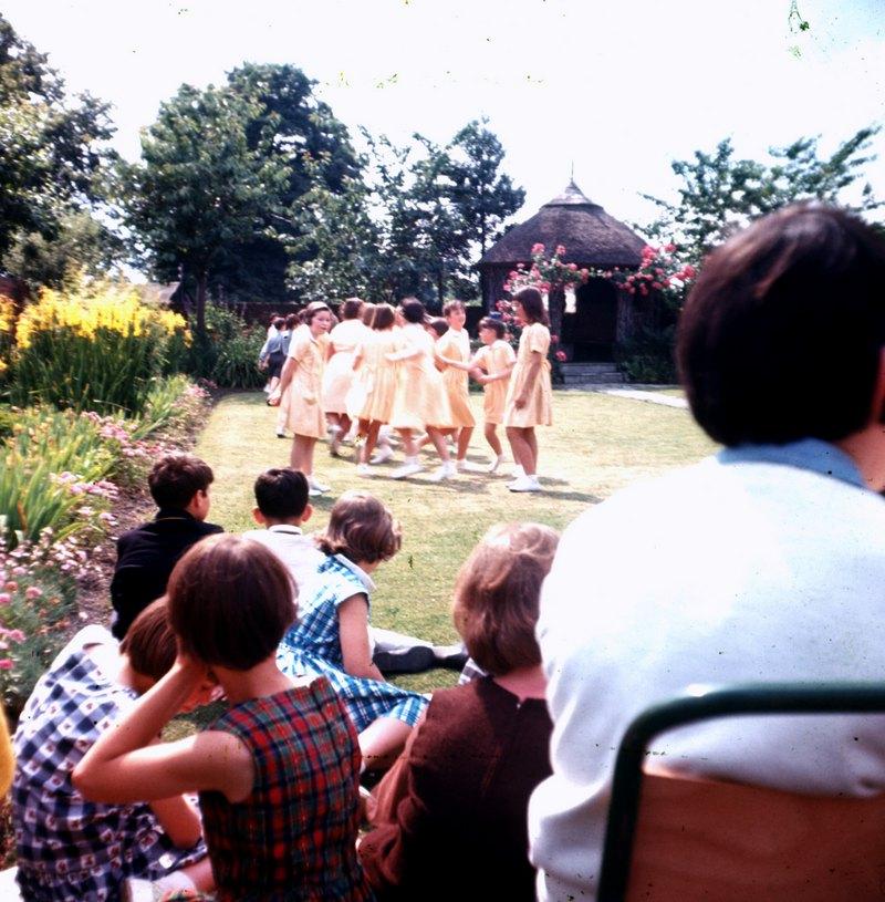 Dancing display in the convent garden during the convent fete, with Rosemarie Wheeler and Fiona Campbell. 1966.