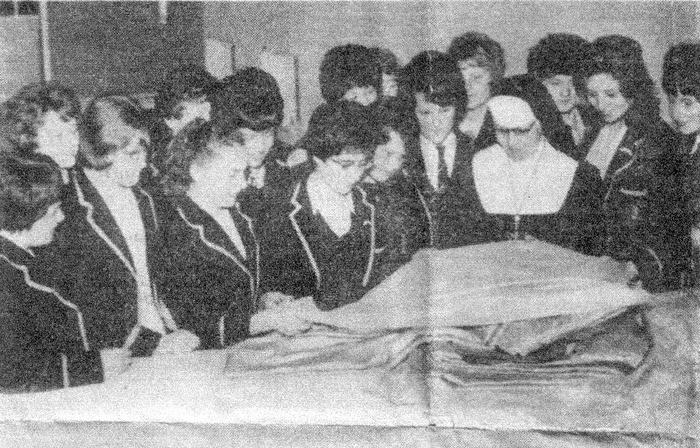 May 1963. Taken from an article in the local newspaper. Headmistress, Sister Patricia and some senior pupils examine the curtains for the stage in the new hall.