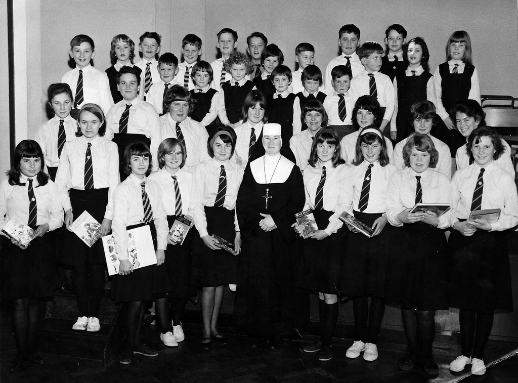 1964. Presentation to Sister Patricia. Left to right: Ann Chislett, Sister Frances Theresa, Sister Patricia, Fr. McNamara, Gill Bush, Sister Mary Peter, Rev. Mother ?, Veronica Weeks. Back row, left to right: ?, Jennifer Brown, Sandra Holley, June Fowler, Mary Gifford, Bernadette Cordery, Miriam Campbell.